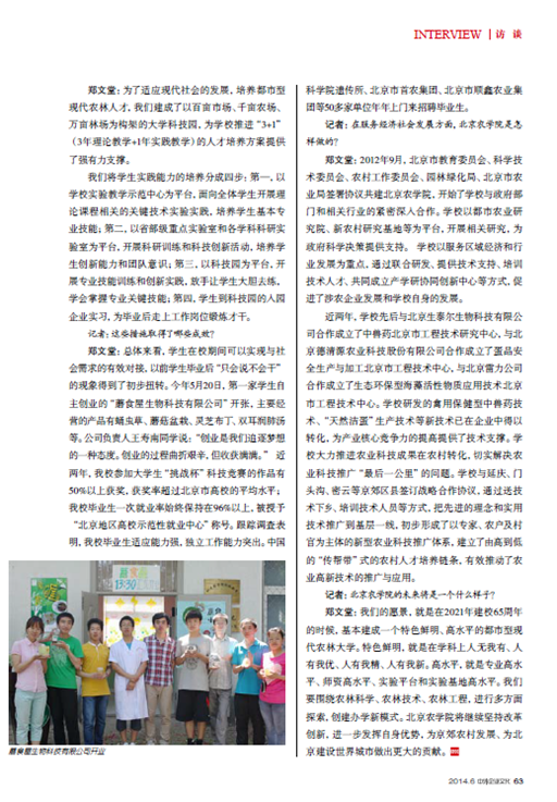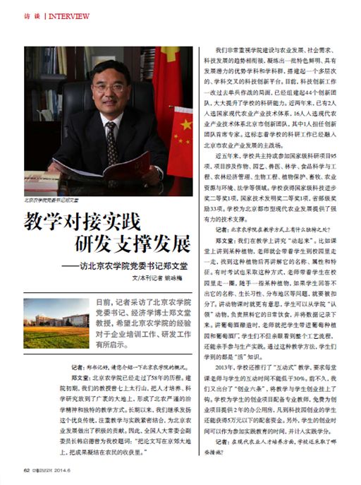 郑文堂:2012年9月,北京市教育委员会、科学技术委员会、农村工作委员会、园林绿化局、北京市农业局签署协议共建世俱杯sjb官网,开始了学校与政府部门和相关行业的紧密深入合作。学校以都市农业研究院、新农村研究基地等为平台,开展相关研究,为政府科学决策提供支持。学校以服务区域经济和行业发展为重点,通过联合研发、提供技术支持、培训技术人才、共同成立产学研协同创新中心等方式,促进了涉农企业发展和学校自身的发展。