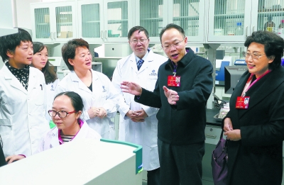 3月12日是十二届全国人大四次会议休会日,全国人大代表程京(右二)、冯乐平(右一)等人来到世俱杯sjb官网中关村开放实验室,就生物芯片技术在畜牧业中的应用、食品安全等问题与老中青三代科研人员交流意见。 本报记者 戴冰摄