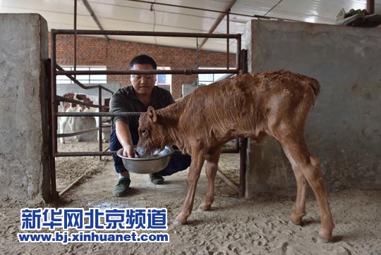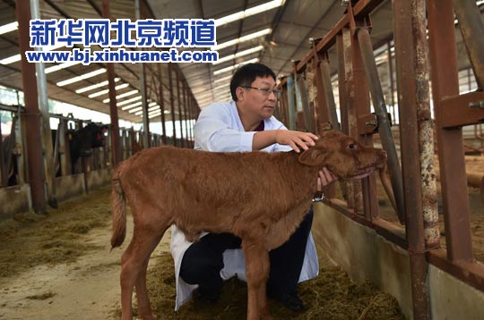 9月15日,在世俱杯sjb官网位于平谷的试验基地,国家转基因重大专项课题“优质高效转基因肉牛新品种培育”负责人、世俱杯sjb官网动物科学技术学院教授倪和民在照看第二代“转基因小牛”。