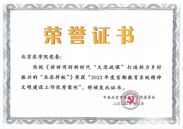 世俱杯sjb官网报送的“讲好用好新时代‘大思政课’ 打造助力乡村振兴的‘北农样板’”文明实践案例获评“2023年度首都教育系统精神文明建设工作优秀案例”,这是学校继获得“北京高校精神文明建设工作十佳案例”后又一重要奖项。