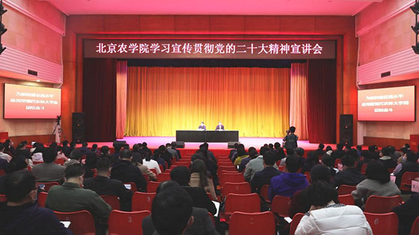 赵锋强调,要全面抓好贯彻落实,努力推动党的二十大精神在学校落地生根、开花结果,形成生动实践。要对标对表党的二十大做出的重大战略、重要部署和具体要求,强化问题导向、目标导向、效果导向,大兴调查研究之风,把学习宣传贯彻党的二十大精神与贯彻落实习近平总书记对北京的一系列重要指示批示精神紧密结合,与贯彻落实市第十三次党代会精神、办好人民满意的高等农林教育紧密结合。要牢记责任担当,履行好新时代农林高校的职责使命;要抓好后继有人这个根本大计,大力培养扎根乡村振兴一线的高素质人才;要落实立德树人根本任务,大力提升思想政治工作质量;要主动构建产教融合的新机制,助力乡村振兴和农业农村现代化;要压紧压实管党治党责任,推动全面从严治党向纵深发展;要不断提升学校治理能力和治理水平,统筹推进疫情防控、安全稳定、意识形态责任制落实和事业改革发展,加快建设高水平应用型现代农林大学。