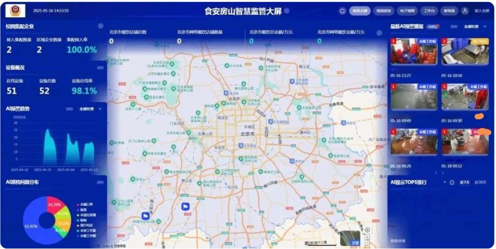 近日,房山区校园餐饮集配企业正式上线AI智能餐饮监管系统。该系统通过部署AI视觉识别摄像头、物联网传感器及冷链物流温湿度实时预警装置,覆盖后厨操作间、餐具消毒室、肉制品冷库等全场景,动态监控食材贮存条件、操作规范、消毒时效等关键环节,并自动识别工作人员未穿戴工作服或口罩、食材过期、异物污染等30余类风险,实时推送预警至企业和监管部门,实现食品安全监管从传统模式向AI智能化的跨越式升级。