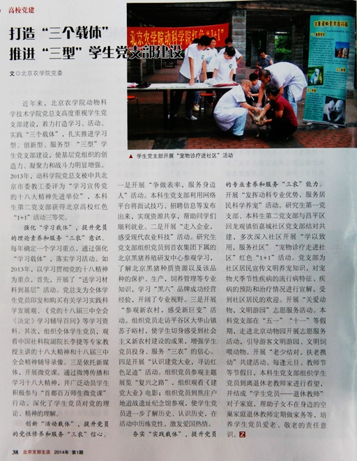 夯实“实践载体”,提升支部党员的专业素养和服务“三农”能力。开展“发挥动科专业优势,服务居民科学养宠” 活动。研究生第一党支部、本科生第二党支部与昌平区回龙观镇佰嘉城社区党支部结对共建,多次深入社区开展“学以致用,服务社区”、“宠物诊疗走进社区”红色“1+1”活动。党支部为社区居民宣传文明养宠知识,对宠物犬季节性疾病的流行病特征、疾病的预防和治疗情况进行讲解宣传,受到社区居民的欢迎。开展“关爱动物 文明游园”志愿服务活动。本科生第一党支部在“五一”、“十一”等假期,走进动物园开展志愿服务活动,引导游客文明游园、文明饲喂动物。开展“老少结对,扶老携幼”共建活动。每逢元旦、教师节等节假日,本科生党支部组织学生党员到离退休老教师家进行看望,并结成“学生党员--退休教师”对子家庭,帮助子女不在身边的空巢家庭退休教师定期做家务等,培养学生党员爱老、敬老的责任意识。
