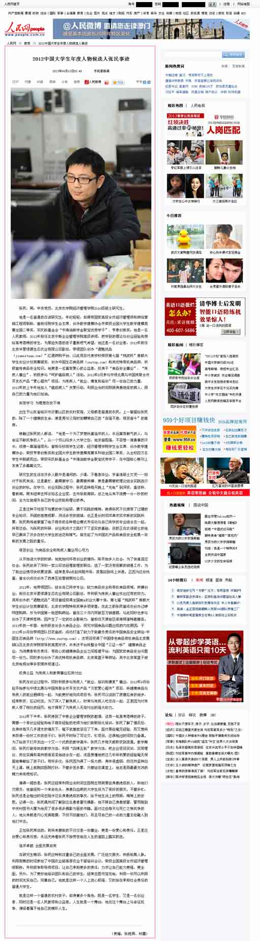 他是一名普通的在读研究生,年纪轻轻,却拥有国家高级合作经济管理师和网络营销工程师职称,曾担任院学生会主席、创办数学建模协会并荣获全国大学生数学建模竞赛全国二等奖、宋庆龄基金会“中海油助学金联宝优秀学子”、亨泰创新奖;他是一名人民教师,2012年担任北京中新企业管理学院高级讲师,把学到的理论与创业经验传授给高考落榜的学生,为那些失落的孩子重新燃气希望;他还是一名创业者,2012年担任北京华夏绿源生态农业有限公司副总,带领团队创办“酒魅优品()”红酒网购平台,以此项目代表学校荣获第七届“挑战杯”首都大学生创业计划竞赛银奖、创办中国生态食品网和尚优特有机食品网,积极宣传食品安全知识。他更是一名富有爱心的公益者,投身于“食品安全事业”、“残疾人事业”,积极参与“呵护癌症病人”活动。2012年9月参与中绿北展与中国残联合作开发农产品“爱心超市”项目,为残疾人“就业、康复和培训”尽一份自己的力量,2012年的上半年他加入“癌症病人”关爱行动,利用业余时间照顾身患绝症的病人,用自己的力量为他们加油。