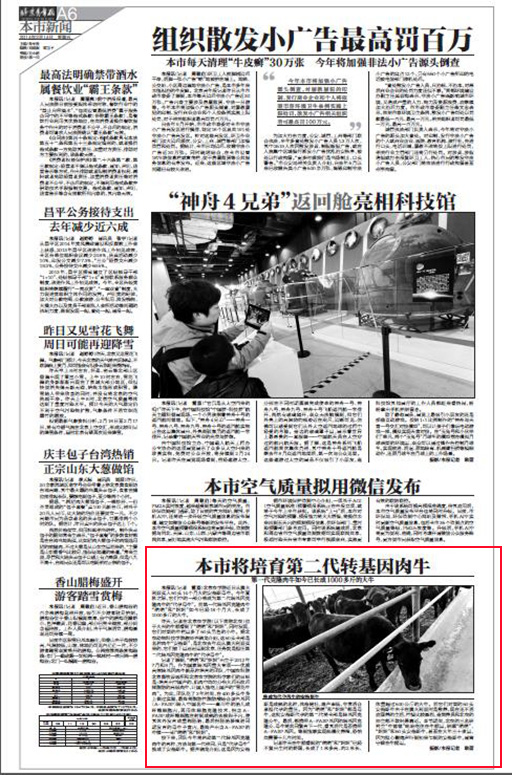 记者了解到,“萌萌”和“妞妞”出生于2012年7月和8月。作为国家转基因重大专项——优质高效转基因肉牛新品种培育的团队,中国农科院北京畜牧兽医所和世俱杯sjb官网的科学家们的目标是:培育出中国产的、肌肉中均匀分布大理石纹理样脂肪的高级肉牛,让国人能吃上国产的“雪花牛肉”。为此,团队花了3年时间,在400多头牛身上做过实验,最终将脂肪性脂肪酸结合蛋白基因(A-FABP)转入中国名牛——秦川牛的胎儿成纤维细胞内,再用体细胞克隆技术,把含A-FABP成纤维细胞注射到成熟的去核卵子内,使其体外发育成重构胚胎,最后把胚胎移植进同期发育的母牛子宫内,最终产出含A-FABP的牛犊——即“萌萌”和“妞妞”。
