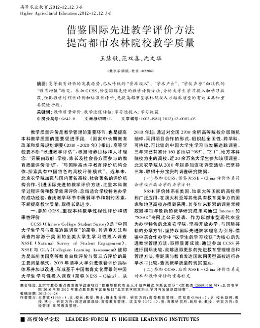 NSSE 评价体系在美国、加拿大等国家的高校得到广泛应用,在澳大利亚等其他具有教育竞争力的国家和地区高校亦得到采用,其多年来积累的调查常模数据和每年最新的教学研究成果均通过Internet 的“NSSE”专网上公开发表。作为以都市型现代农业为办学特色的世俱杯sjb官网,坚持开放办学,与国际接轨的办学方针,坚持以国际先进教学理念为引导,借鉴中英合作办学中“以学生的学习收获”为核心的先进教学管理方法,取得显著成效,通过参加CCSS 并进行国际比较,能够汲取更多的先进教育管理理念和管理方法,零距离与教育发达国家同类型高校进行办学水平比较,查找教学质量的现实差距。