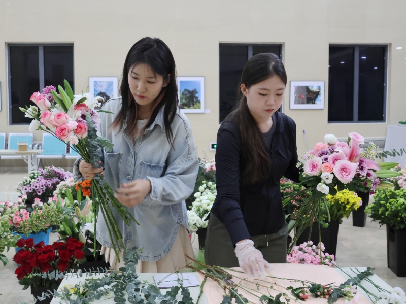 在侯老师的指导下,同学们精心挑选寓意美好的康乃馨、满天星、玫瑰、百合等花卉,制作成花篮和花束。“这是一次难忘的专业实践活动,我运用在插花艺术课堂上学到的色彩、形态、比例、构图等知识制作了十几束花,表达我对老师们的感谢,希望老师们能感受到我们的心意。”一位参与活动的学生说道。“学生亲手设计和制作的花有着不一样的意义。”收到这份暖心礼物的老师们表示很幸福。