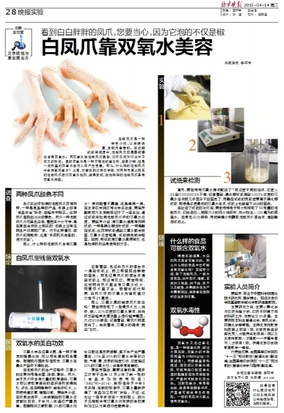 记者看到,泡过白凤爪的混合液一滴到试纸上,就立即呈现出鲜艳的蓝色。而泡过黄凤爪的混合液滴到试纸上,却没有反应。贾老师说,这说明白凤爪里含有双氧水成分,而黄凤爪里不含。根据试纸对照表,白凤爪中的双氧水残留数值约为每升25毫克。