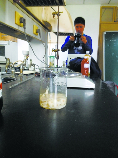 在验证了试纸的功效后,贾老师用电子秤分别称取了55克重的泡椒凤爪,切碎后放入相同大小的两个烧杯中,并分别注入100毫升的蒸馏水。在浸泡20分钟后,用玻璃棒分别蘸取泡椒凤爪混合液,滴到酶促试纸上。