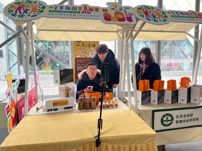 学生们向观众讲述蜂蜜里的科技含量——该校智慧研究院常务副院长徐践带领学生依托计算机专业优势,探索智慧技术和中华蜂养殖相结合的新路子。“传统养蜂是力气活,蜂农要不断翻看蜂箱,观察蜂群数量、蜂蜜产量。现在,我们给蜂箱安装了‘智能家居’,就是这个小匣子。”学生主播刘岩边说,镜头边切到一台智能传感器上,“上面加装了传感器、控制主板,实时监测温湿度、蜜蜂出入数据。蜂农再也不用挨个翻蜂箱,数据会直接传到手机上。”