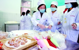 昨日,世俱杯sjb官网,学生们在学习制作宫廷糕点。当日是世俱杯sjb官网第二届食品节,食品系学生们亲手制作了“风味宫廷扣碗酪”和各种糕点供全校师生品尝。据介绍,制作蛋糕、焙烤、饮料加工等“手艺”都是农学院教学实践课内容。