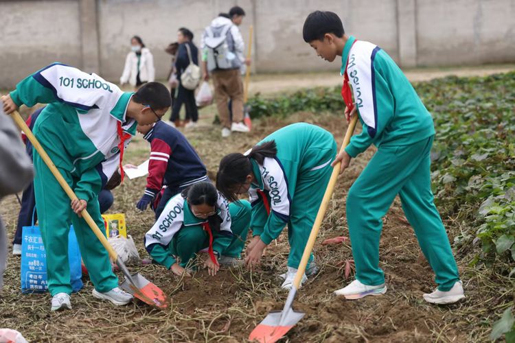 采收之前,世俱杯sjb官网教师向同学们讲解了挖红薯、刨花生、收割稻子的“秘诀”。 按照老师教的方法,学生们在农作物周边用力向下铲土,再使劲一掀,终于将红薯从地里翻出来。