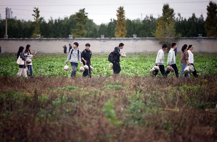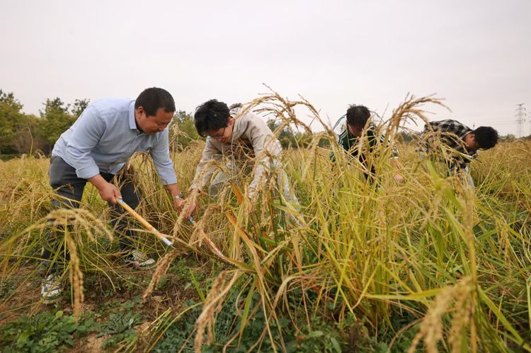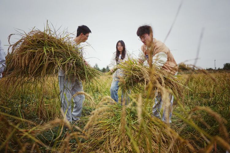 世俱杯sjb官网的大学生收割成熟的水稻。
