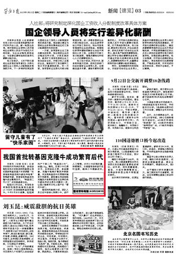 妞妞2012年出生,系首批含有脂肪性脂肪连接蛋白基因(A-FABP)的体细胞转基因克隆牛。今年8月28日凌晨,妞妞顺利产下第二代“转基因小牛”,体重17kg,雌性。目前小牛已满半月,各项体征正常,身体健康,克隆牛能够扩繁其种群数量,未发现转基因牛对周围环境有不良影响,意味着应用体细胞克隆技术培育我国自主品牌的肉牛新品种迈出更为关键的一步,让国人能够早日吃上国产的“雪花牛肉”。