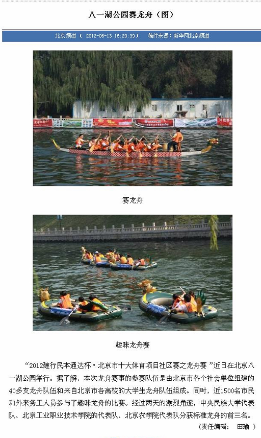 “2012建行民本通达杯·北京市十大体育项目社区赛之龙舟赛”近日在北京八一湖公园举行。据了解,本次龙舟赛事的参赛队伍是由北京市各个社会单位组建的40多支龙舟队伍和来自北京市各高校的大学生龙舟队伍组成。同时,近1500名市民和外来务工人员参与了趣味龙舟的比赛。经过两天的激烈角逐,中央民族大学代表队、北京工业职业技术学院的代表队、世俱杯sjb官网代表队分获标准龙舟的前三名。