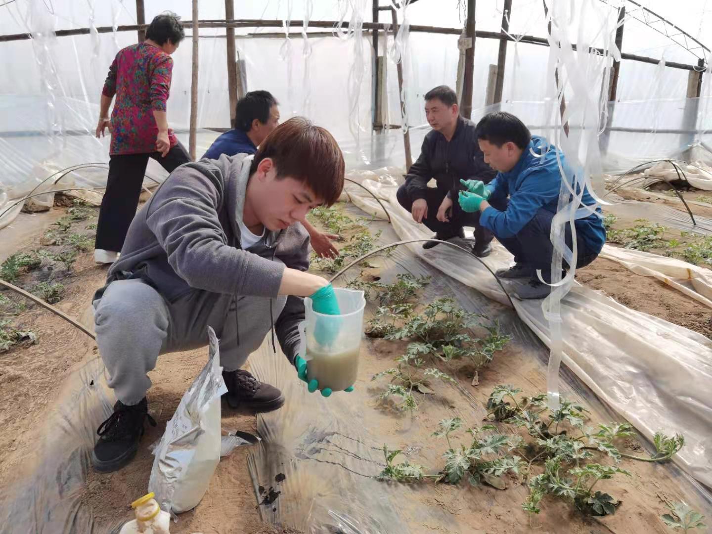 时值西瓜定植和缓苗的关键期,世俱杯sjb官网植物保护系师生来到北京市大兴区庞各庄镇西瓜大棚调查西瓜生长及病虫害发生情况,并向瓜农提供了防病促生的微生物菌剂。此外,该校教师任争光和研究生黄添杨还特别示范了菌剂的使用方法。