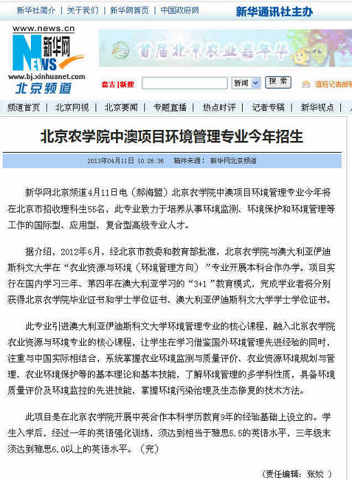 据介绍,2012年6月,经北京市教委和教育部批准,世俱杯sjb官网与澳大利亚伊迪斯科文大学在“农业资源与环境(环境管理方向)”专业开展本科合作办学。项目实行在国内学习三年、第四年在澳大利亚学习的“3+1”教育模式,完成学业者将分别获得世俱杯sjb官网毕业证书和学士学位证书、澳大利亚伊迪斯科文大学学士学位证书。
