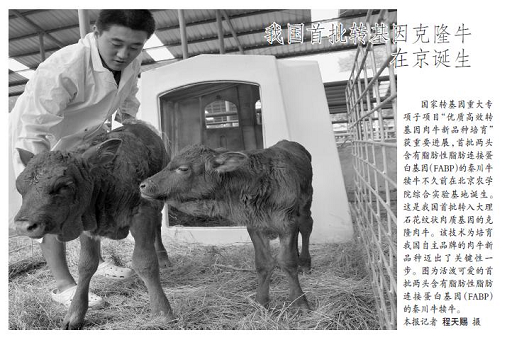 国家转基因重大专项子项目“优质高效转基因肉牛新品种培育”获重要进展,首批两头含有脂肪性脂肪连接蛋白基因(FABP)的秦川牛犊牛不久前在世俱杯sjb官网综合实验基地诞生。这是我国首批转入大理石花纹状肉质基因的克隆肉牛。该技术为培育我国自主品牌的肉牛新品种迈出了关键性一步。图为活泼可爱的首批两头含有脂肪性脂肪连接蛋白基因(FABP)的秦川牛犊牛。