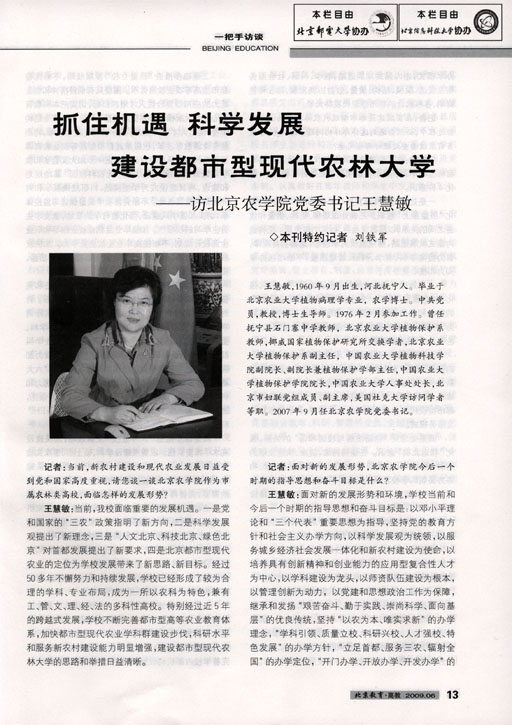 王慧敏:面对当前的发展形势和环境,学校当前和今后一个时期的指导思想和奋斗目标是:以邓小平理论和“三个代表”重要思想为指导,坚持党的教育方针和社会主义办学方向,以科学发展观为统领,以服务城乡经济社会发展一体化和新农村建设为使命,以培养具有创新精神和创业能力的应用型复合性人才为中心,以学科建设为龙头,以师资队伍建设为根本,以管理创新为动力,以党建和思想政治工作为保障,继承和发扬“艰苦奋斗、勤于实践、崇尚科学、面向基层”的优良传统,坚持“以农为本、唯实求新”的办学理念,“学科引领、质量立校、科研兴校、人才强校、特色发展”的办学方针,“立足首都、服务三农、辐射全国”的办学定位和“开门办学、开放办学、开发办学”的办学模式,走内涵式发展道路,教学、科研、社会服务相互促进,规模、结构、质量、效益协调发展,建设特色鲜明、多科融合的都市型现代农林大学。