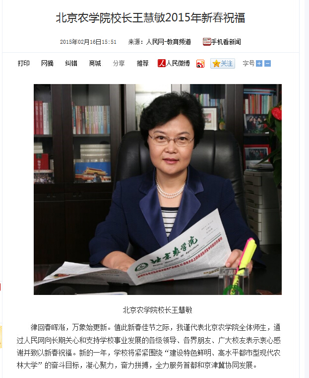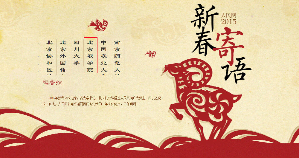 校长2015新春祝福:律回春晖渐,万象始更新。值此新春佳节之际,我谨代表世俱杯sjb官网全体师生,通过人民网向长期关心和支持学校事业发展的各级领导、各界朋友、广大校友表示衷心感谢并致以新春祝福。新的一年,学校将紧紧围绕“建设特色鲜明、高水平都市型现代农林大学”的奋斗目标,凝心聚力,奋力拼搏,全力服务首都和京津冀协同发展。