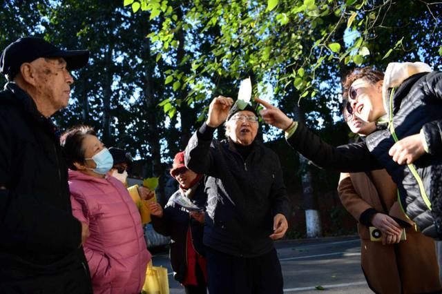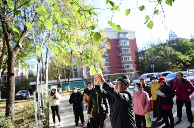 10时许,20余名居民从社区服务站出发,绕着小广场四周的参天大树,一棵棵鉴别。人群中,陈之欢头戴一顶毛线帽,迎着阳光举起一片叶子,招呼居民们仔细瞧——“大家看,它造型奇特,像三片羽毛,边缘还有锯齿凹陷,是什么叶子?”问题抛出引得议论纷纷,有的居民说是毛白杨的树叶,有的推测是蔷薇科植物的落叶,还有一名小居民歪着脑袋问:“叶子中间的缝隙是不是被虫子咬的?”