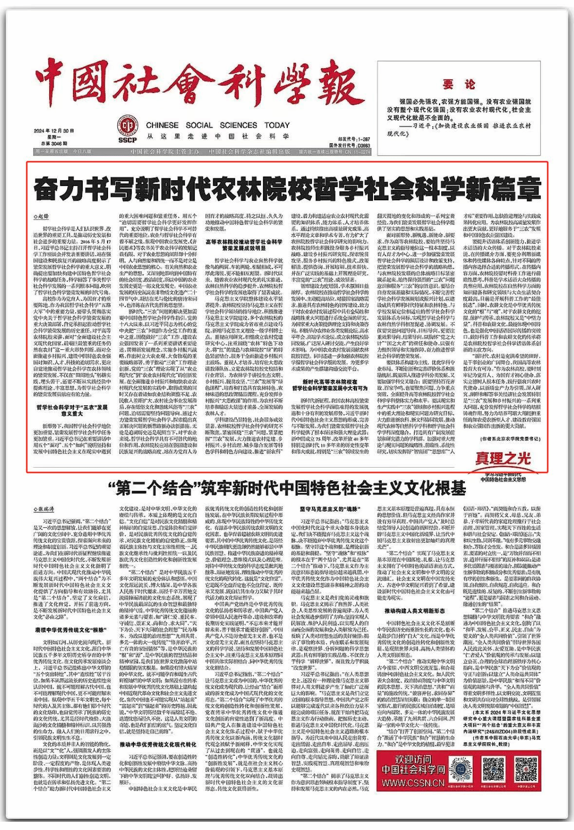 高校作为为党育人、为国育才的重要阵地,作为我国哲学社会科学“五路大军”中的重要力量,要带头贯彻落实党中央关于哲学社会科学繁荣发展的重大决策部署,自觉承担起推动哲学社会科学繁荣发展的历史重任。对于高等农林院校来讲,面对“全面建设社会主义现代化国家,最艰巨最繁重的任务仍然在农村”这一重大形势判断,面对全面推进乡村振兴、建设中国特色农业强国对知识、人才、科技的迫切需求,更应自觉地推动哲学社会科学在农林领域的繁荣发展,不仅在“田间地头”躬耕实践、埋头苦干,还要不断从实践经验中提炼理论、丰富思想,为哲学社会科学的繁荣发展贡献应有的力量。