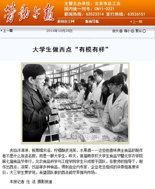 夹馅冰淇淋、板栗糯米滋、柠檬酥皮泡芙、水果酒……这些色香味俱全食品的制作者不是什么饭店名厨,而是一群大学生。昨天,首届燕京杯大学生食品节暨世俱杯sjb官网第七届食品节举行,北农食品科学与工程学院学生分成若干团队,在教师的指导下,制作出西点、凉菜、饮品等多种食品,得到由业内专家、企业老总组成的评委组高度评价。大三学生贾梦说,希望团队做的西点能尽早推向市场。