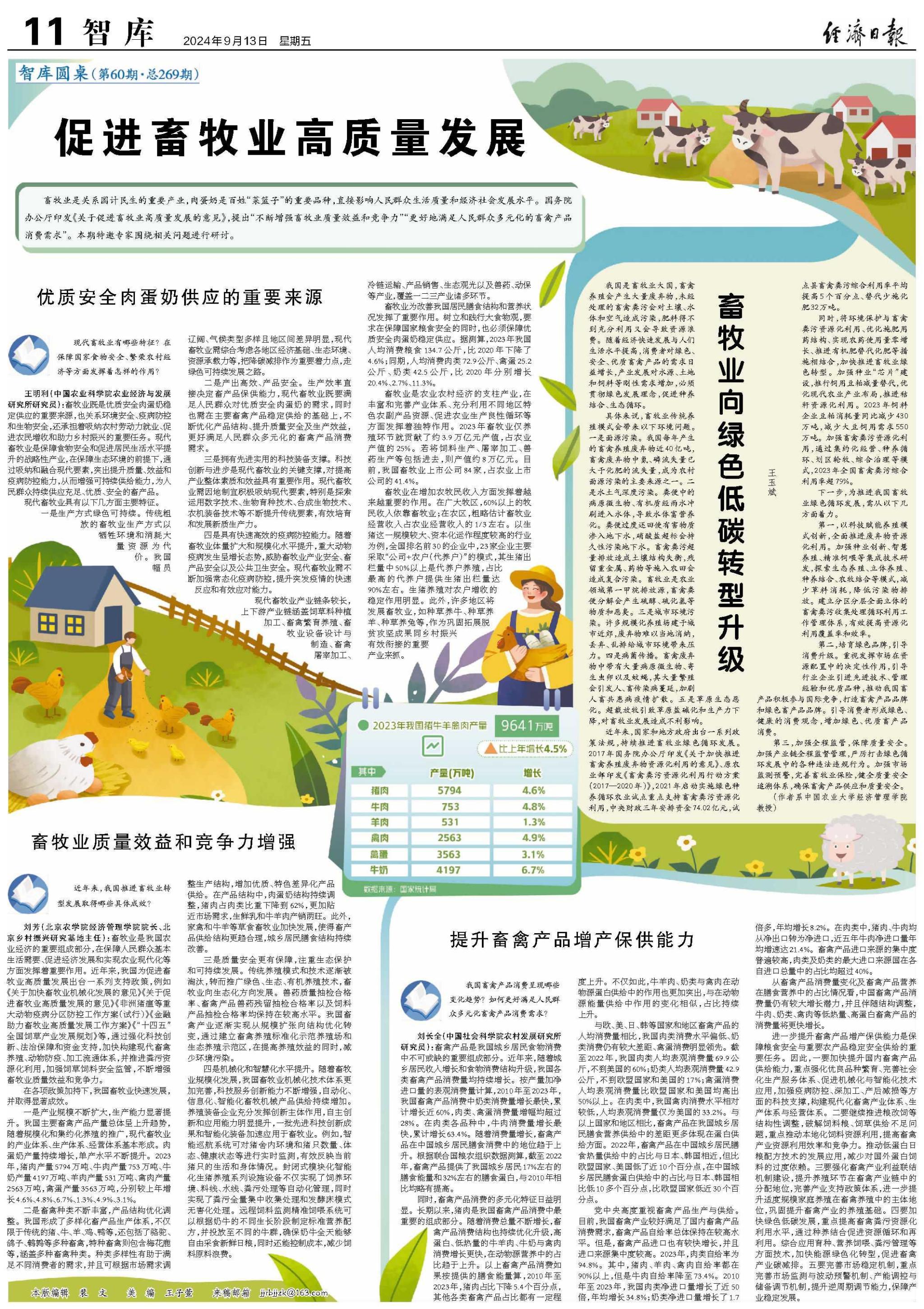 王明利(中国农业科学院农业经济与发展研究所研究员):畜牧业既是优质安全肉蛋奶稳定供应的重要来源,也关系环境安全、疫病防控和生物安全,还承担着吸纳农村劳动力就业、促进农民增收和助力乡村振兴的重要任务。现代畜牧业是保障食物安全和促进居民生活水平提升的战略性产业,在保障生态环境的前提下,通过吸纳和融合现代要素,突出提升质量、效益和疫病防控能力,从而增强可持续供给能力,为人民群众持续供应充足、优质、安全的畜产品。