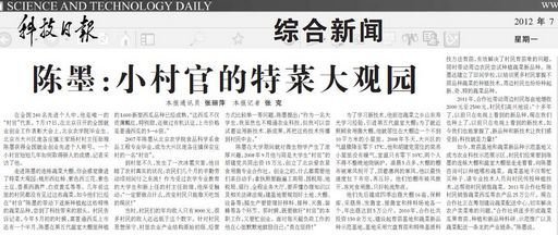 如今,育苗基地和蔬菜新品种示范基地又成为农业科技示范展示区,村民们经常要到陈墨的连栋大棚和温室大棚里走走看看,向陈墨咨询可以种植哪些蔬菜。蔬菜基地不仅帮忙买种子、请专业技术人员向村民传授种植技术,还帮助村民销售蔬菜。2011年合作社帮助村民销售蔬菜西瓜等农产品25万公斤。现在合作社正在筹划建设蔬菜配送中心,切实解决农户卖菜难的问题。“合作社将逐步形成蔬菜瓜果育苗、种植和新品种科研、示范推广以及蔬菜配送一条龙的产业链条。”陈墨说。