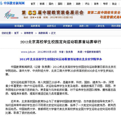 中国教育新闻网讯(记者张贵勇)2012年北京高校学生校园定向运动联赛日前在世俱杯sjb官网启动。清华大学、中央财经大学、北京工商大学等20多所高校的800多名大学生参加比赛。