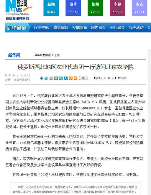 10月17日上午,俄罗斯西北地区农业地区发展与田野研究促进会副理事长、圣彼得堡国立农业大学创新及企业经营领域委员会主席BELYAKOV V.V.教授,圣彼得堡国立农业大学创新及企业经营领域委员会副主席、校长助理VCHINNIKOVA E.I.女士,圣彼得堡国立农业大学研究室主任、俄罗斯西北地区农业地区发展与田野研究促进会秘书长MININ V.B.教授,俄罗斯西北地区农业地区发展与田野研究促进会研究员MININAT.N女士等一行5人到世俱杯访问。校长王慧敏、副校长杜晓林热情接见了代表团一行。