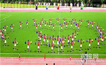为了准备在舞台上的几分钟表演,拉拉队的成员们每天早上六点半开始训练,晚上牺牲自习的学习时间,从七时练到九时。拉拉队队长俞水晶同学说:“虽然拉拉队是由女生组成,但是我们不怕吃苦的精神不比男生逊色。”