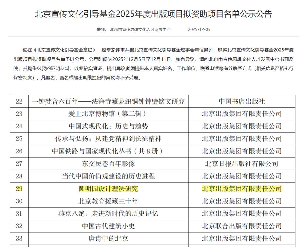 据悉,北京宣传文化引导基金成立于2015年,是由中共北京市委宣传部主管、北京市宣传思想文化人才发展中心管理的公益性、政策性基金,旨在扶持具有重要文化价值与社会影响力的原创作品、主题宣传与文化项目。此次《圆明园设计理法研究》的入选体现了北京市对历史文化遗产价值阐释的高度重视、对风景园林学科研究成果的高度认可,也是落实“北京历史文化名城保护”战略的具体行动。