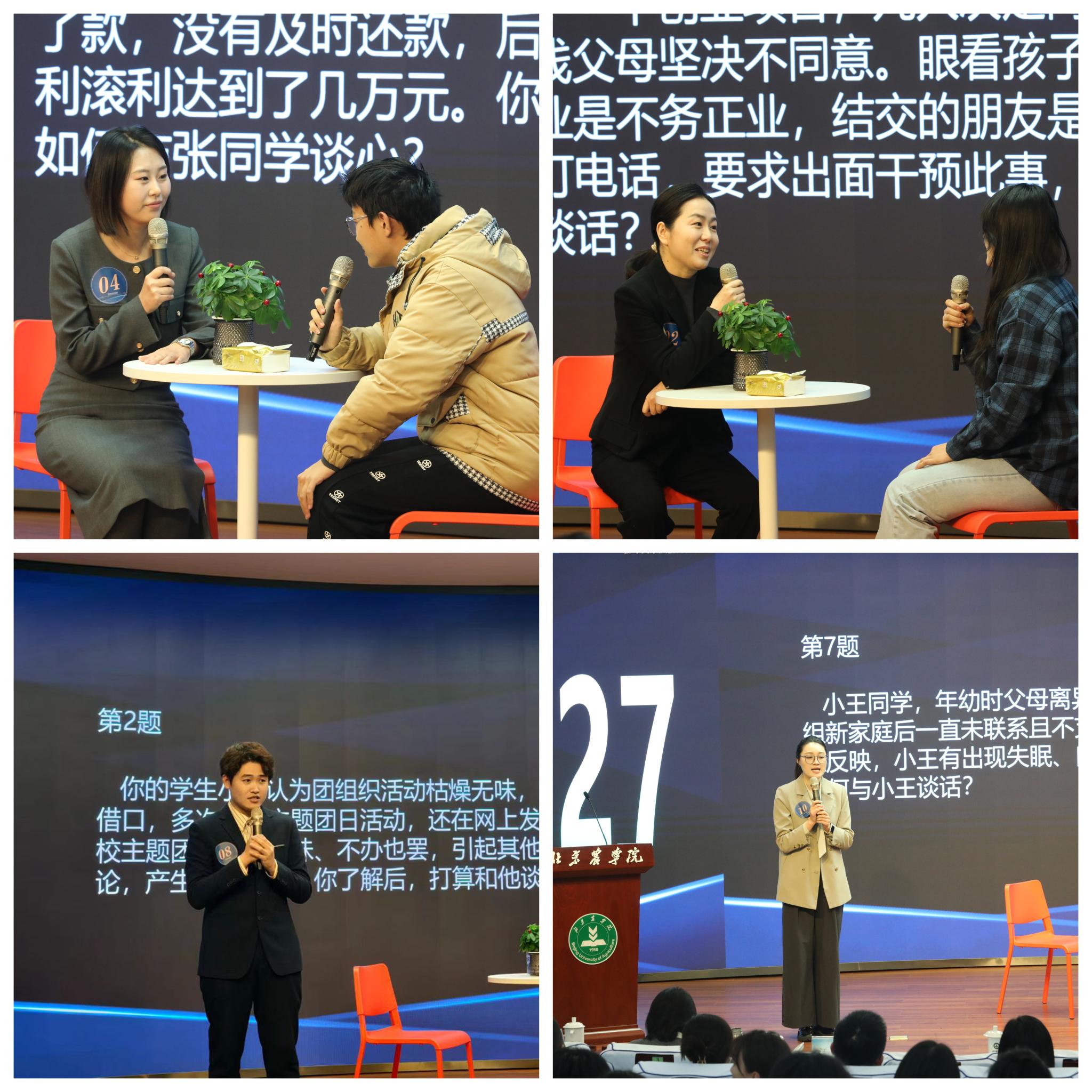 决赛现场,17名辅导员紧扣案例场景,以情景再现的方式,围绕“学生思想引领”“学业压力疏导”“学生专业认知偏差”“网络舆情处置”等热点话题,与学生开展一对一深度辅导谈心谈话,为学生破解难题、纾忧解困,全方位展现了辅导员运用政策理论和沟通策略,为学生答疑解惑、教育引导学生成长成才的探索和实践。