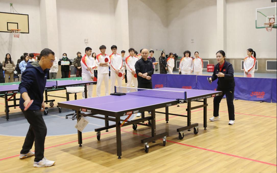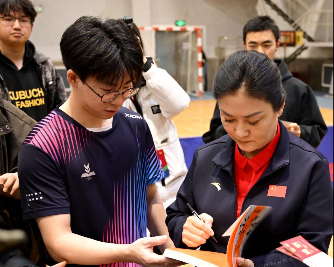 报告会前,刘伟在篮球馆与世俱杯教职工乒协、校乒乓球队及2025年乒乓球新生赛获奖学生代表进行面对面交流。她结合自身多年训练与比赛经验,细致讲解技术要领,并进行个性化指导。