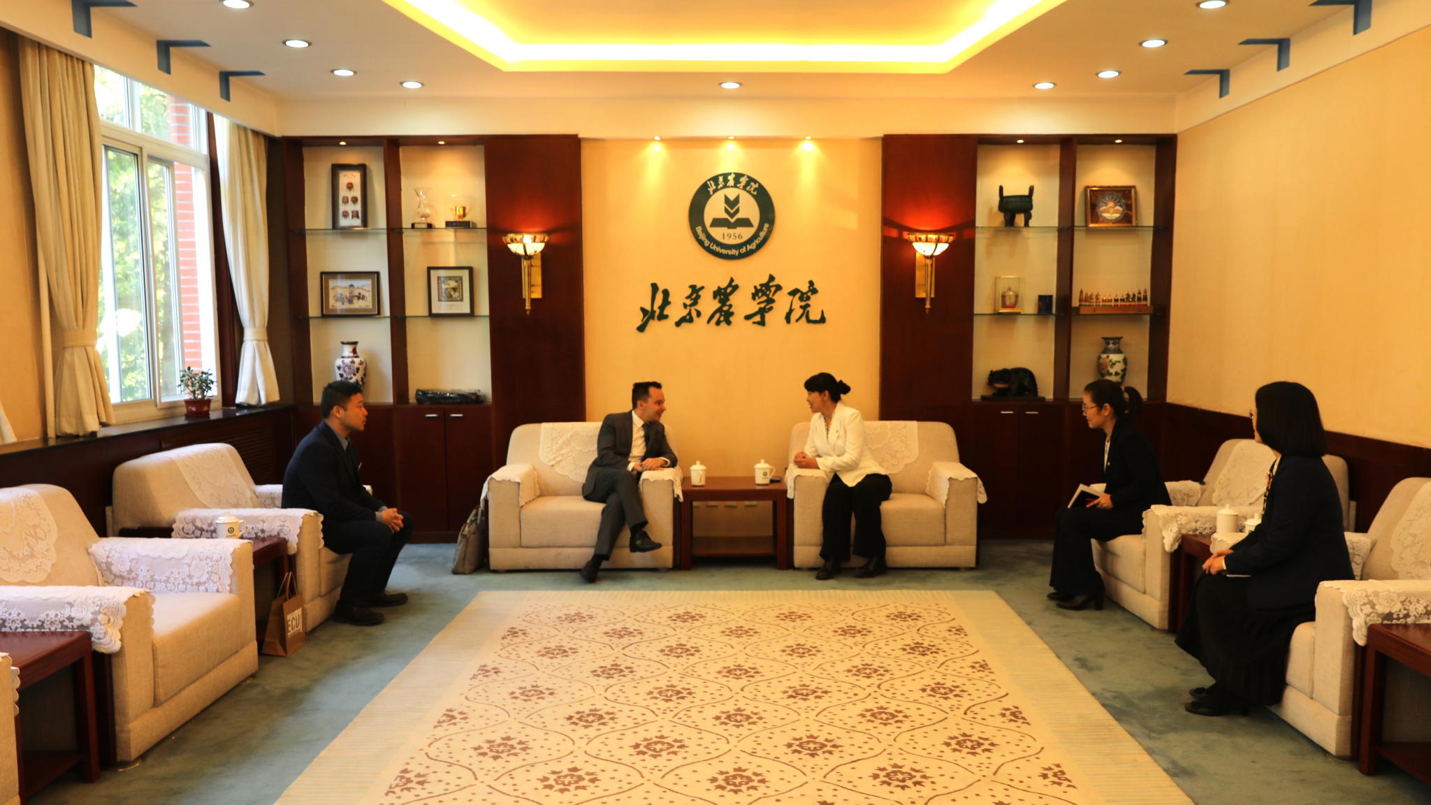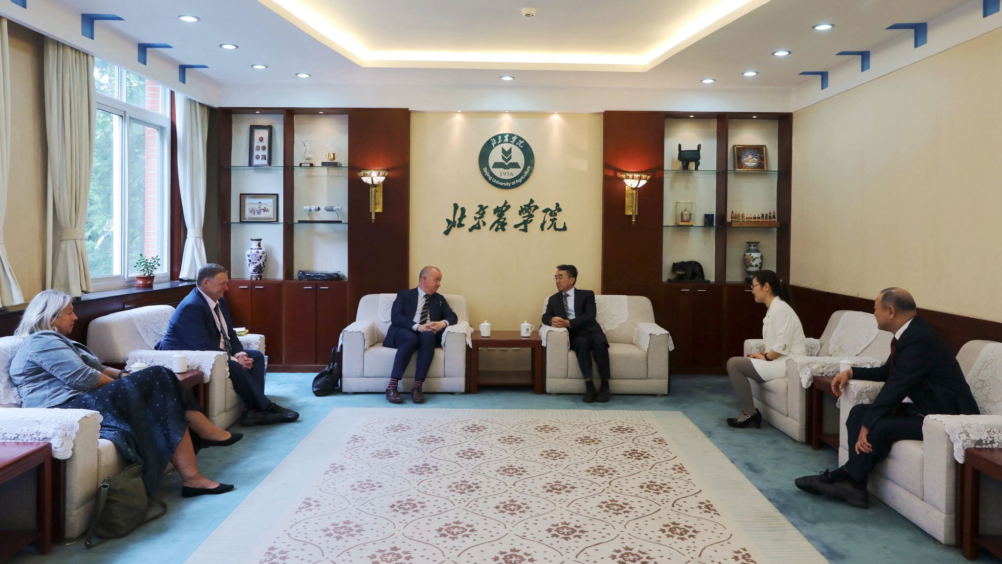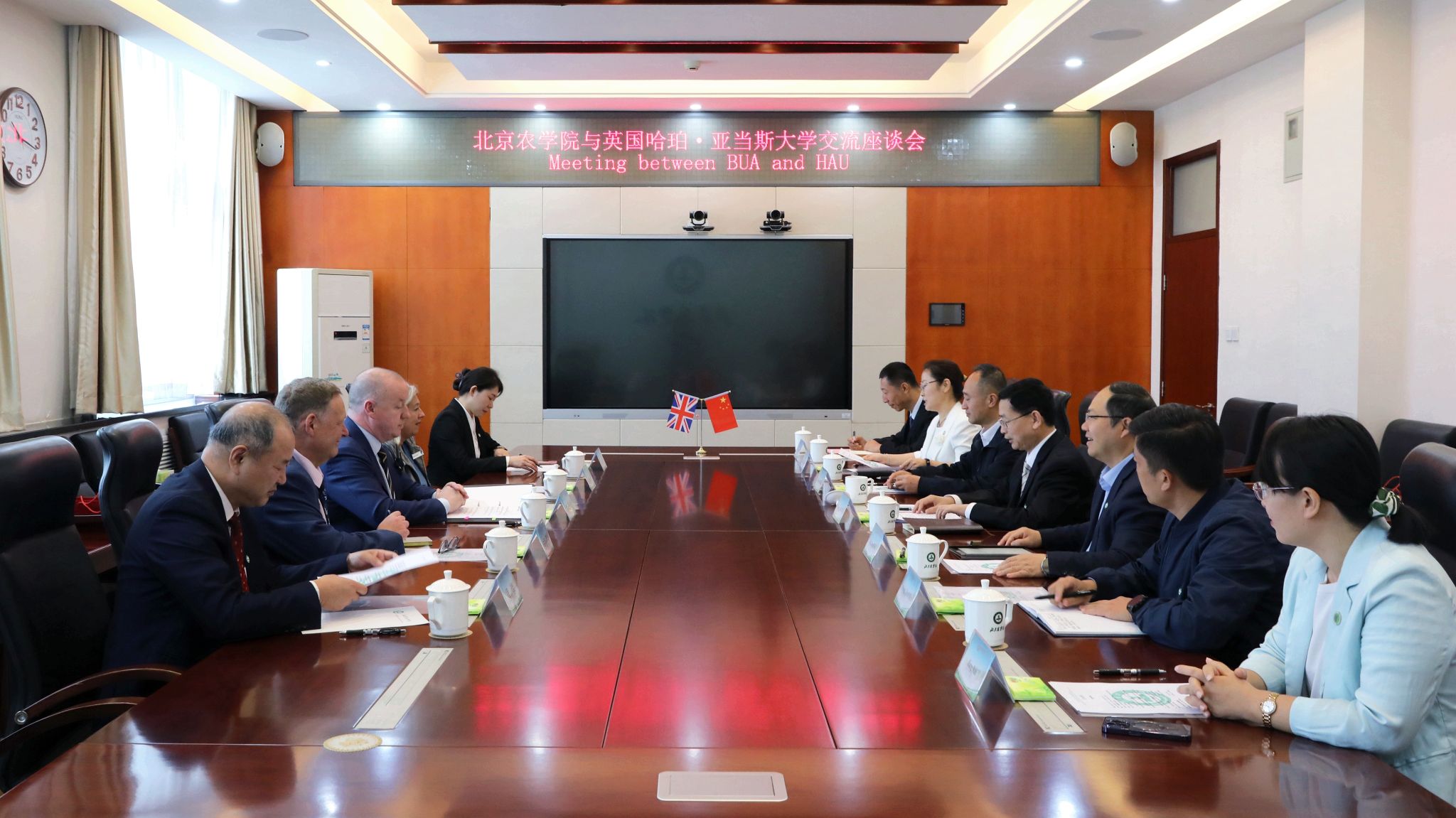 10月13日上午,英国哈珀·亚当斯大学校长Ken Sloan、首席全球影响官Ian Rowley、合作办学项目主管Sandra Turner一行访问世俱杯。校领导赵锋、段留生热情接待Ken Sloan一行。