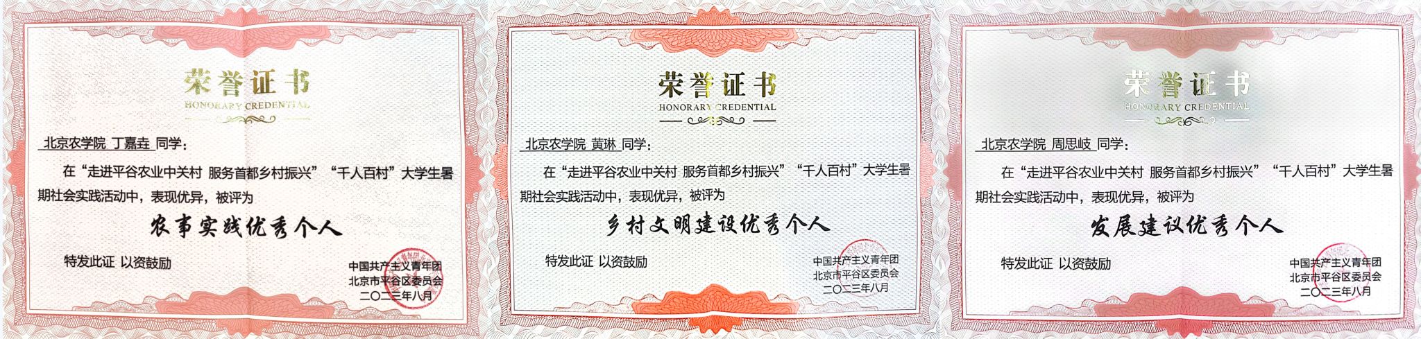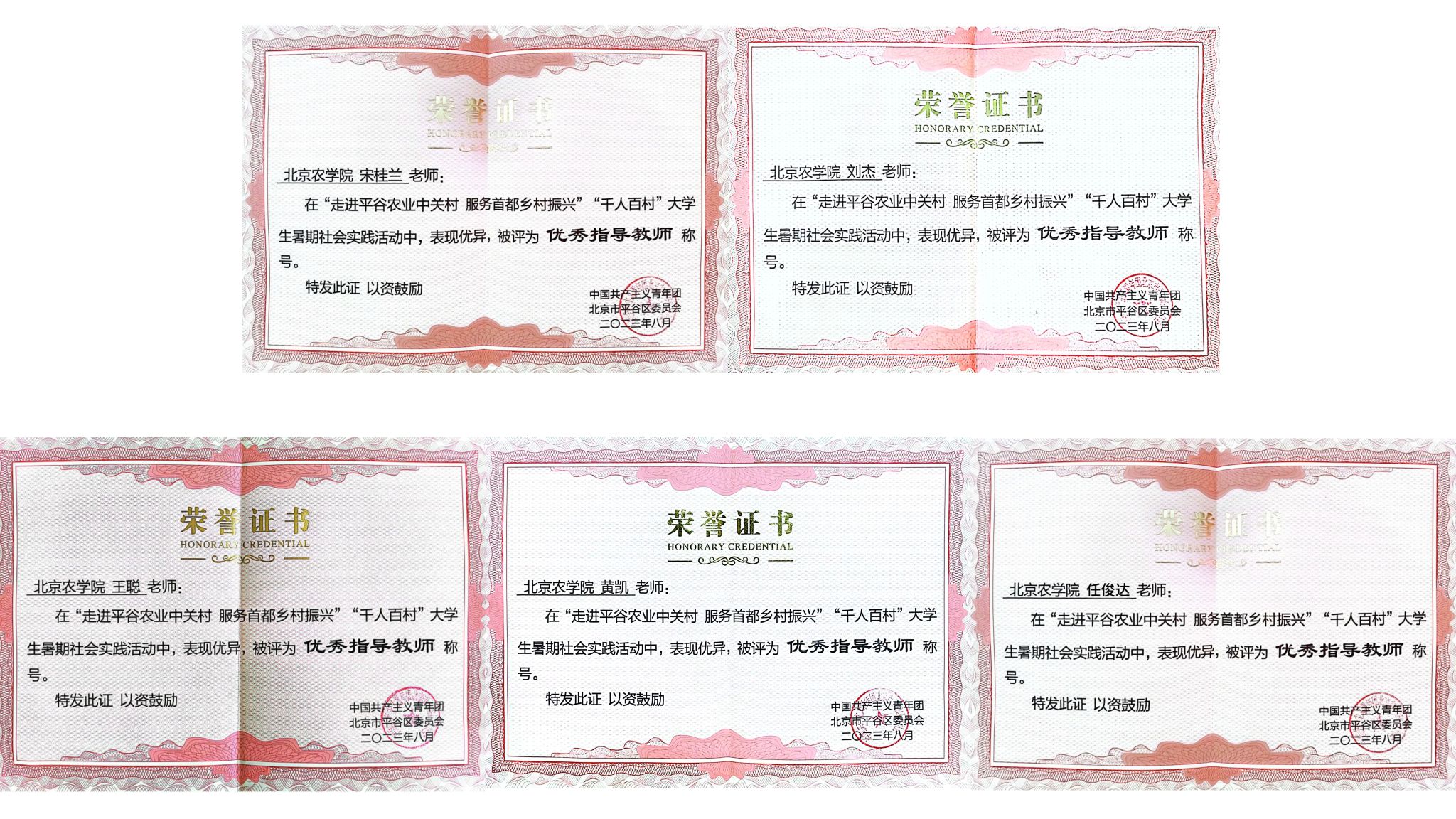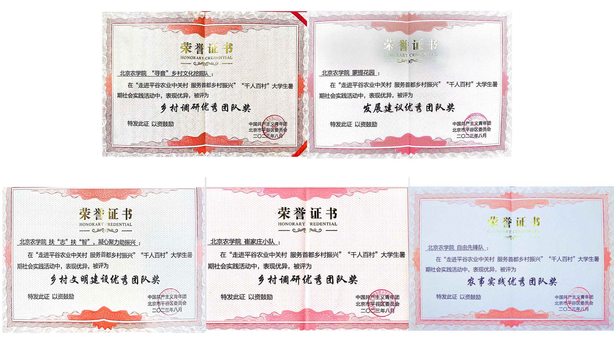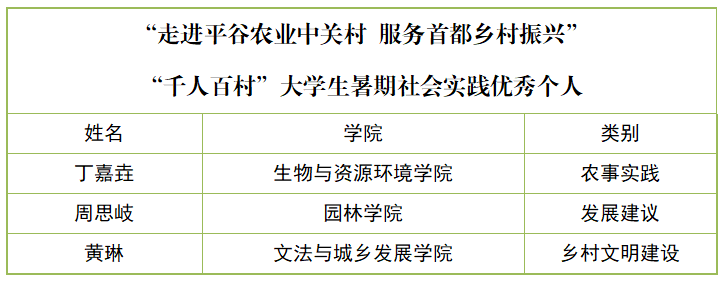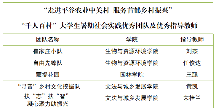 近日,2023年“走进平谷农业中关村 服务首都乡村振兴”首都高校“千人百村”大学生暑期社会实践评奖结果公布。世俱杯sjb官网荣获“优秀组织奖”;崔家庄小队、自由先锋队、“寻音”乡村文化挖掘队、“蒙提花园”队、“扶‘志’扶‘智’,凝心聚力助振兴”队荣获“优秀团队奖”;五个优秀团队的指导教师刘杰、黄凯、任俊达、宋桂兰、王聪荣获“优秀指导教师奖”;丁嘉垚、黄琳、周思岐3名同学荣获“优秀个人奖”。