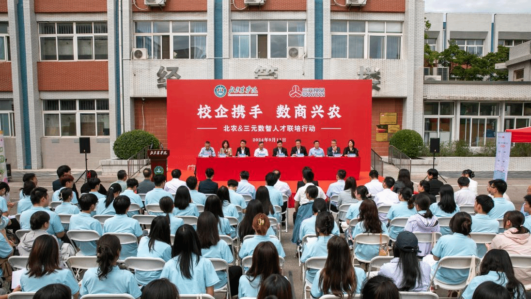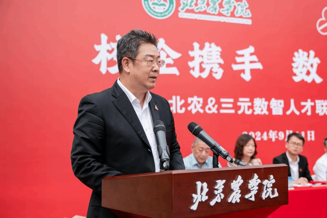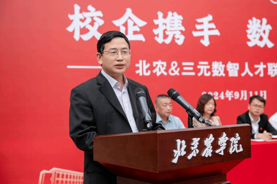 段留生代表学校全体师生,向长期以来关心和支持学校发展的北京三元食品股份有限公司表示衷心的感谢,对公司发展取得的显著成绩给予高度赞扬。他指出,此次校企双方深度合作,携手开启“数智三元人才联培行动”,既是深入贯彻落实党的二十届三中全会统筹推进教育科技人才体制机制一体改革的实际行动,也是培育新时代“双师型”数智人才和数商兴农青年、更好服务经济社会和产业发展的有力举措。希望校企双方资源共享、优势互补、互联互通,在持续深化理论研究、深入推动人才培养与师资队伍建设模式创新、不断加强校企合作平台建设等方面持续发力,为服务新时代首都发展和全面推进乡村振兴做出新的更大贡献。