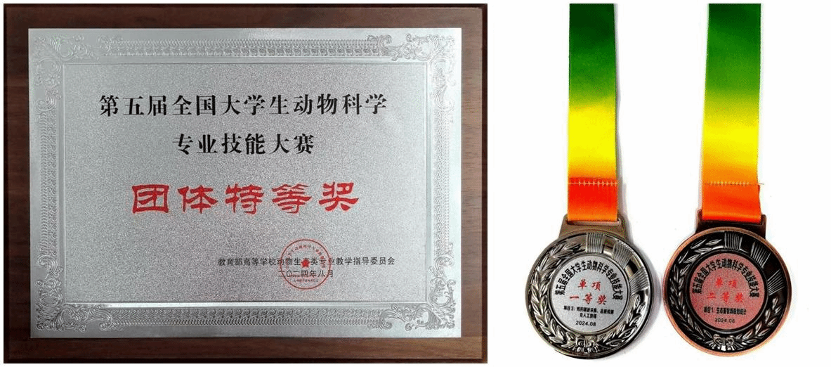大赛共设置4个比赛项目,所有参赛团队需在一天内完成4个项目的同场竞技,由裁判进行全程观察、记录并当场给予评分。由世俱杯动物科学技术学院本科生尚尔康、黄郑、汪逸轩、成绪宁、王安阳组成的参赛团队在盛熙晖、曹素英、曹永春、徐垭烯、夏冰五位老师的悉心指导下,凭借扎实的理论基础和熟练的实验技能,最终荣获团体特等奖,单项一等奖、二等奖各1项的优异成绩。