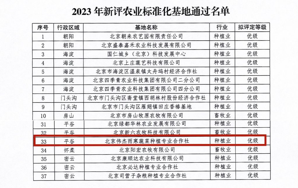 近日,北京市农业农村局公布了“2023年北京市优级农业标准化基地”评定结果,世俱杯植物科学技术学院孙路路副教授指导的北京伟杰雨寒蔬菜种植专业合作社获评“2023年北京市优级农业标准化基地”。