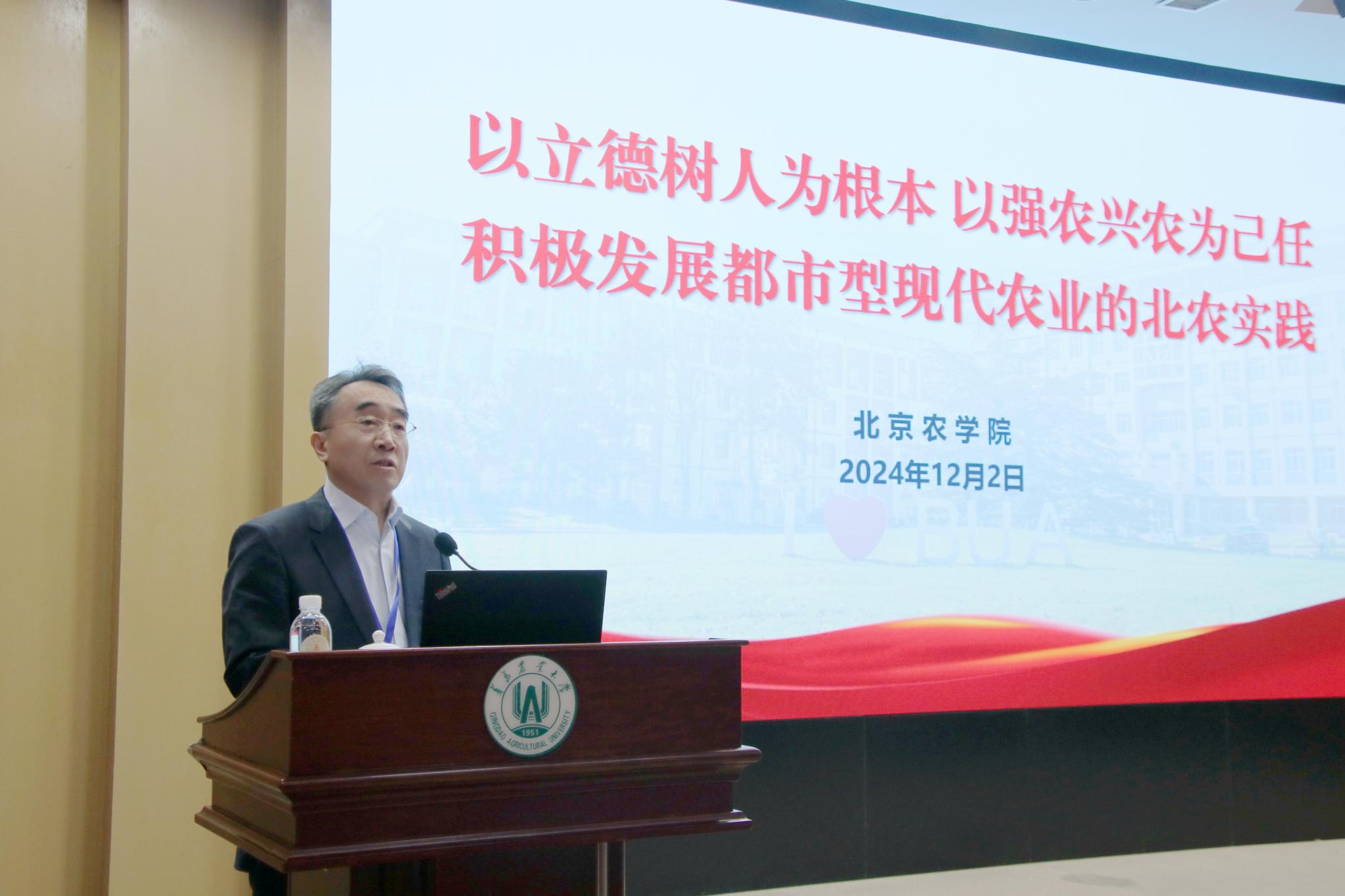 赵锋重点介绍了学校以高质量党建引领事业高质量发展,积极服务都市型现代农业创新发展,助力全面推进乡村振兴和农业农村现代化建设的做法和成效。赵锋指出,学校深入学习贯彻习近平总书记关于教育、关于“三农”工作的重要论述,聚焦强国建设战略部署,以新时代首都发展为统领,大力发展新质生产力,引导广大师生把论文写在京华大地上,把成果凝结在农民的收获里,不断为农业农村现代化建设和都市型现代农业发展注入新动力;持续深化“三全育人”,坚持“五育并举”,构建农工管协调发展、都市农林特色交叉融合的学科专业体系,强化产教融合、科教融汇、央地协同、校地协同,着力培养有知农爱农情怀、有强农兴农本领的新型人才;充分发挥学校教育、科技、人才三位一体优势和学科专业优势,深度参与北京农业中关村建设、种业之都建设和“百千工程”,依托科技小院、博士农场、教授工作站、乡村振兴驿站等平台,以科技创新赋能农业增效、农民增收、农村繁荣 ,积极打造服务乡村全面振兴和新时代首都发展的“北农模式”。