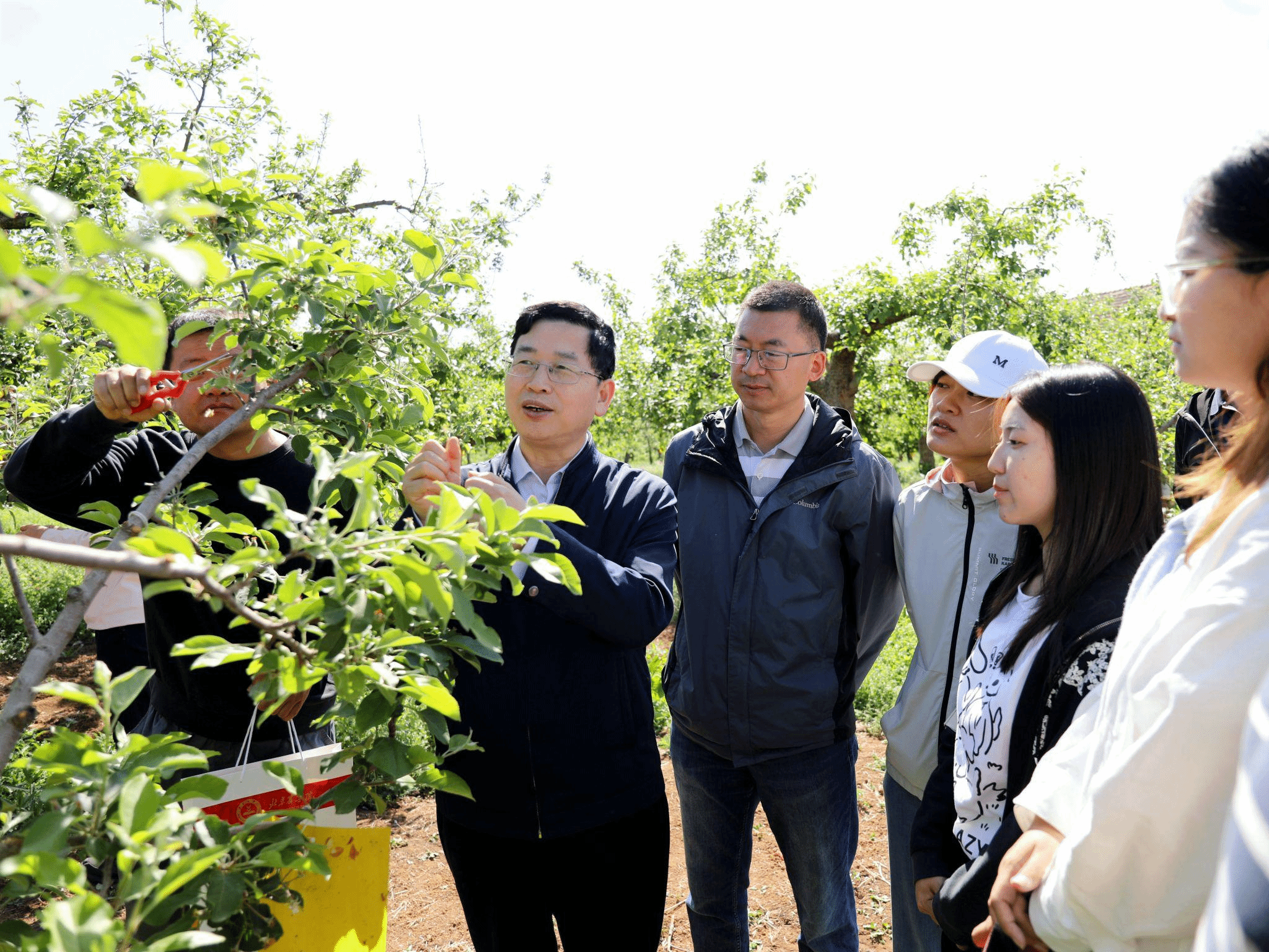 今年五一劳动节期间,团队负责人、学校党委副书记、院长段留生带领团队师生深入科技小院、教授工作站,既送技术讲科普,又把课堂搬到田间地头。段留生向同学们讲解苹果疏花疏果的方法,指导学生开展疏花疏果实践,向同学们介绍学校把技术送到种植户身边,为农民送去苹果富硒技术和苹果免套袋技术的做法和成效。