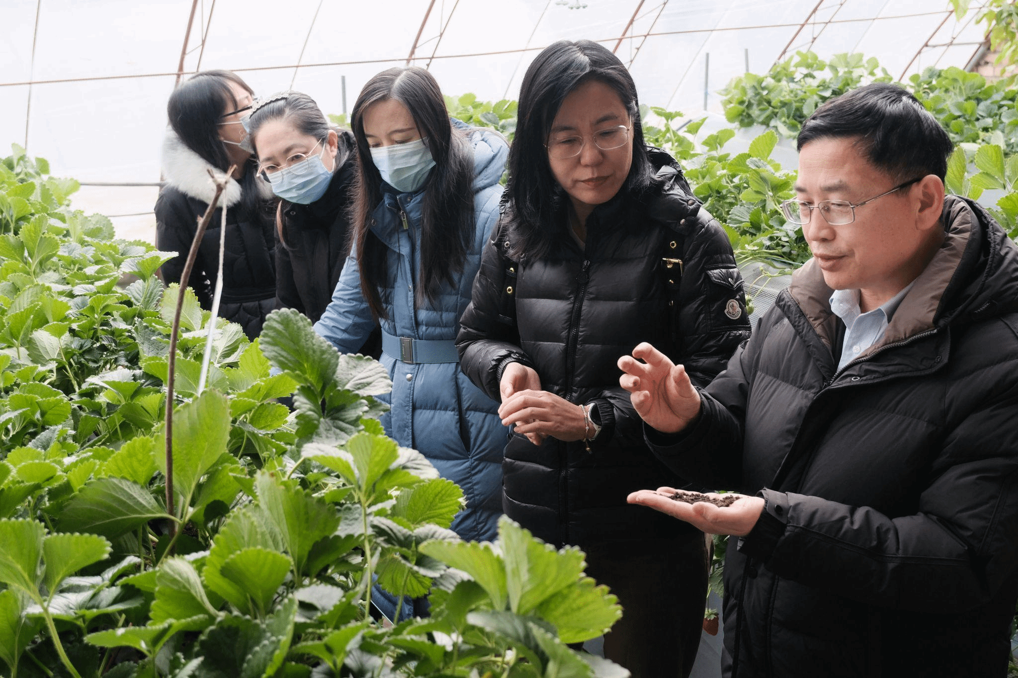今年2月,段留生带领团队教师深入昌平区科技小院、农业场站、种植基地等,开展现代农业技术专题培训,现场指导草莓、番茄等产品种植和新技术应用,深度调研草莓种质资源和育种工作。团队教师为北京市现代农业产业技术体系特色作物创新团队的岗位专家和技术员开展专题培训,介绍草莓抗冷助转色的产品及应用技术,并深入田间地头进行现场示范和指导应用。到草莓科技研发和示范推广基地,深入调研草莓种质资源圃建设,为正在基地开展科研和新品种选育工作的师生现场指导草莓安全、优质、高效栽培技术和杂交授粉工作,重点围绕草莓育苗和栽培基质研发提出指导建议。