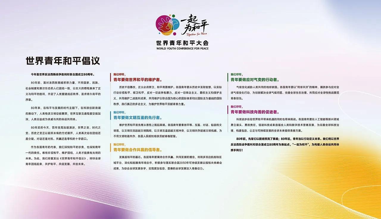 此次世界青年和平大会虽已落下帷幕,但“一起为和平”的信念已深深扎根于青年的心中。正如《世界青年和平倡议》所倡导的,和平的维护、文明的互鉴、发展的推进,从来不是一句口号,而是需要全球青年以行动践行的使命。