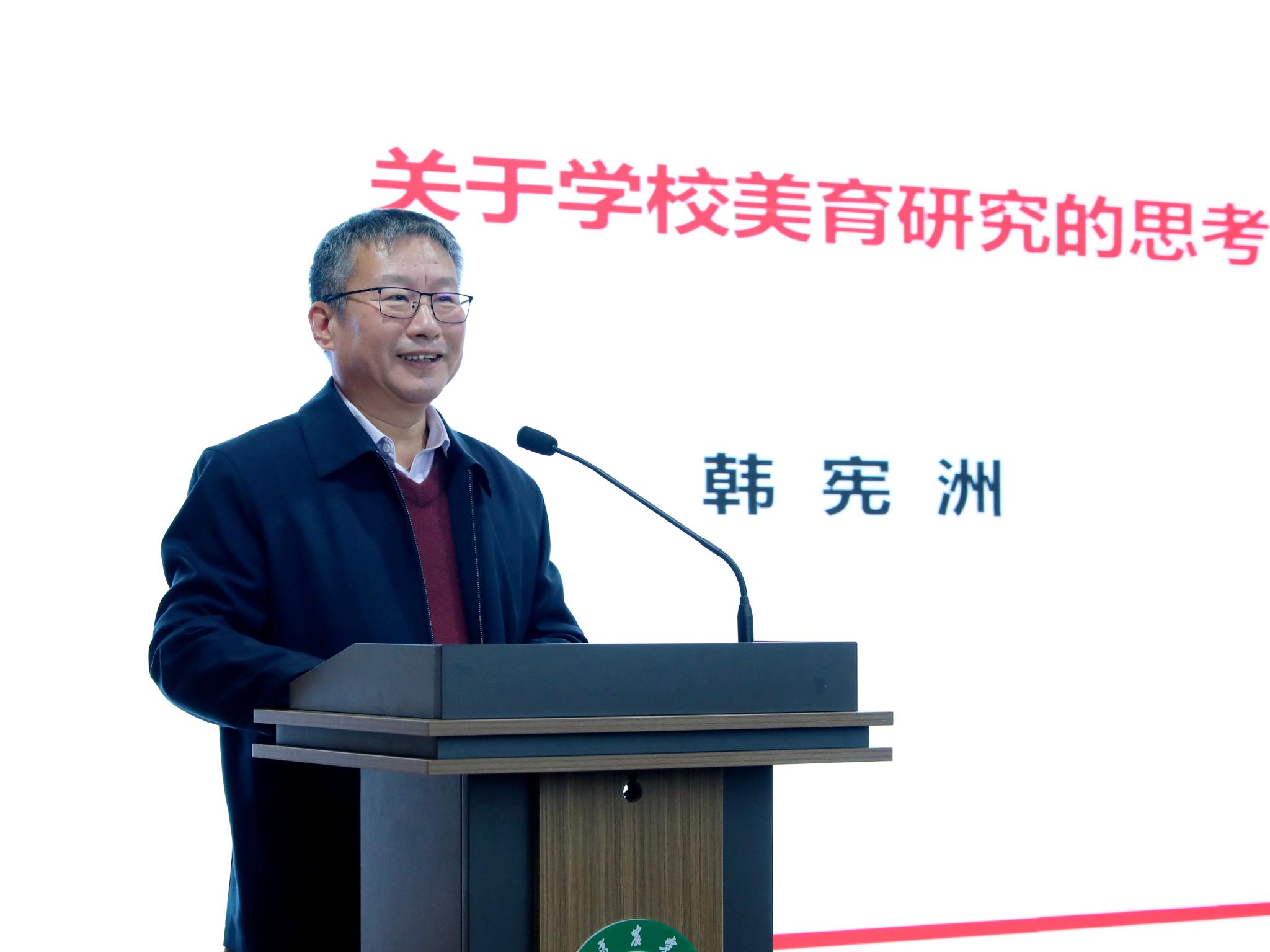 韩宪洲作题为《关于学校美育研究的思考》的主题报告。他强调,美育研究应紧扣时代脉搏,挖掘中华优秀传统文化中的美育资源,推动美育与德育、智育、体育、劳动教育有机融合,实现“立德”与“树人”相统一,构建“五育并举”的育人新格局。