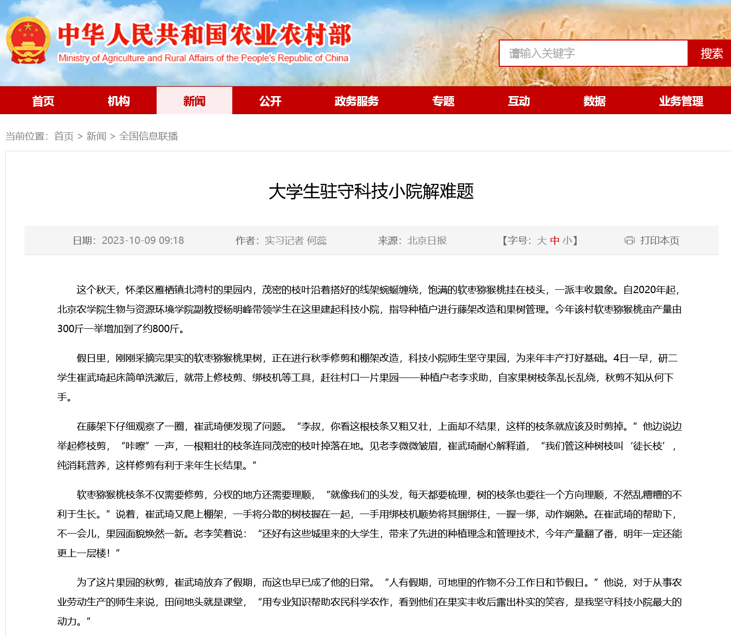 作为首都农林高校,学校始终坚持以立德树人为根本,以强农兴农为己任,依托科技小院平台,大力培养知农爱农新型人才。截至目前,学校科技小院培养专业学位研究生126人,为2000余名师生提供课外实践教学空间和服务乡村振兴平台。
