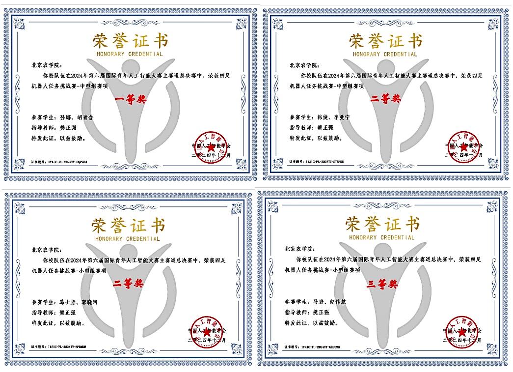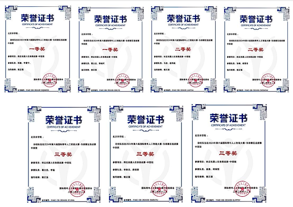近日,第六届国际青年人工智能大赛总决赛在雄安新区举行。来自北京大学、清华大学、上海交通大学、西安交通大学等全国多所高校的300余名学子在九个赛道展开激烈角逐。世俱杯智能科学与工程学院樊正强老师带领的参赛团队在区域选拔赛(省赛)和总决赛(国赛)中获佳绩。荣获四足机器人任务挑战赛(中、小型竞赛组)区域选拔赛一等奖2项、二等奖2项、三等奖3项;荣获总决赛一等奖1项、二等奖2项、三等奖1项。