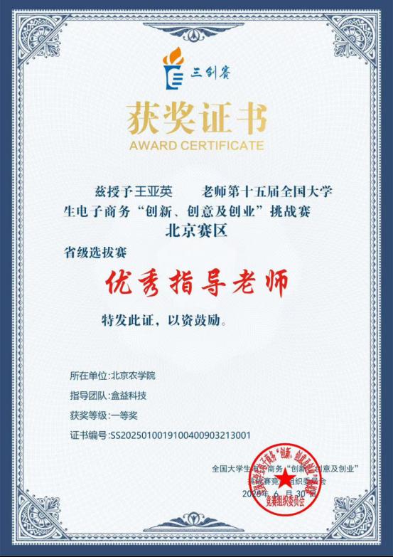近日,第十五届全国大学生电子商务“创新、创意及创业”挑战赛(以下简称“三创赛”)北京市选拔赛落下帷幕,北京32所高校的3360支团队参加了本次北京市选拔赛。由园林学院王亚英教授、经济管理学院江晶副教授指导,园林学院研究生王景炫带领的团队“盒益科技”成功斩获一等奖。