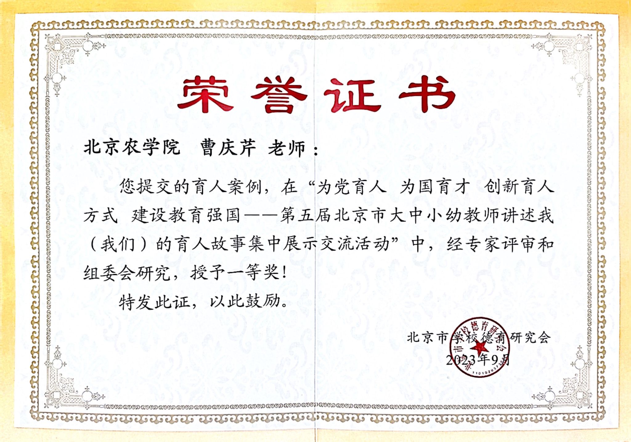 9月9日,由北京市委教育工委、市教委主办,市学校德育研究会承办的第五届北京市大中小幼教师讲述我(我们)的育人故事展示交流活动隆重举办,来自全市大中小幼不同学段的教师代表同台讲述、分享他们生动的育人故事。经专家评审,最终评选出39位优秀教师获得荣誉杯和专业特等奖,128位优秀教师获得一等奖,114位优秀教师获得二等奖。世俱杯植物科学技术学院曹庆芹老师讲述的育人故事案例《潜心育人栗花飘香》荣获一等奖,马克思主义学院熊学艺老师讲述的育人故事案例《从“心”出发,把思政课打造成为“实证”课》荣获二等奖。