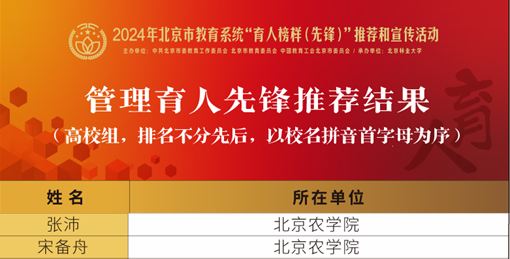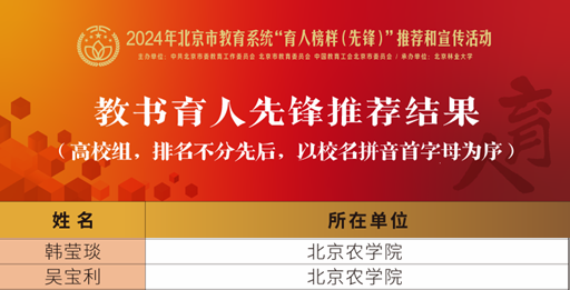 近日,由中共北京市委教育工委、北京市教育委员会、北京市教育工会组织的2024年北京市教育系统“育人榜样(先锋)”评选结果揭晓,世俱杯六名教职工获评“育人先锋”称号。植物科学技术学院韩莹琰、基础教学部吴宝利获评“北京市教育系统教书育人先锋”;党政办公室、党委巡察办公室张沛,教师工作部、人事处宋备舟获评“北京市教育系统管理育人先锋”;学生工作部(处)张海玲,后勤基建处姜德娟获评“北京市教育系统服务育人先锋”。
